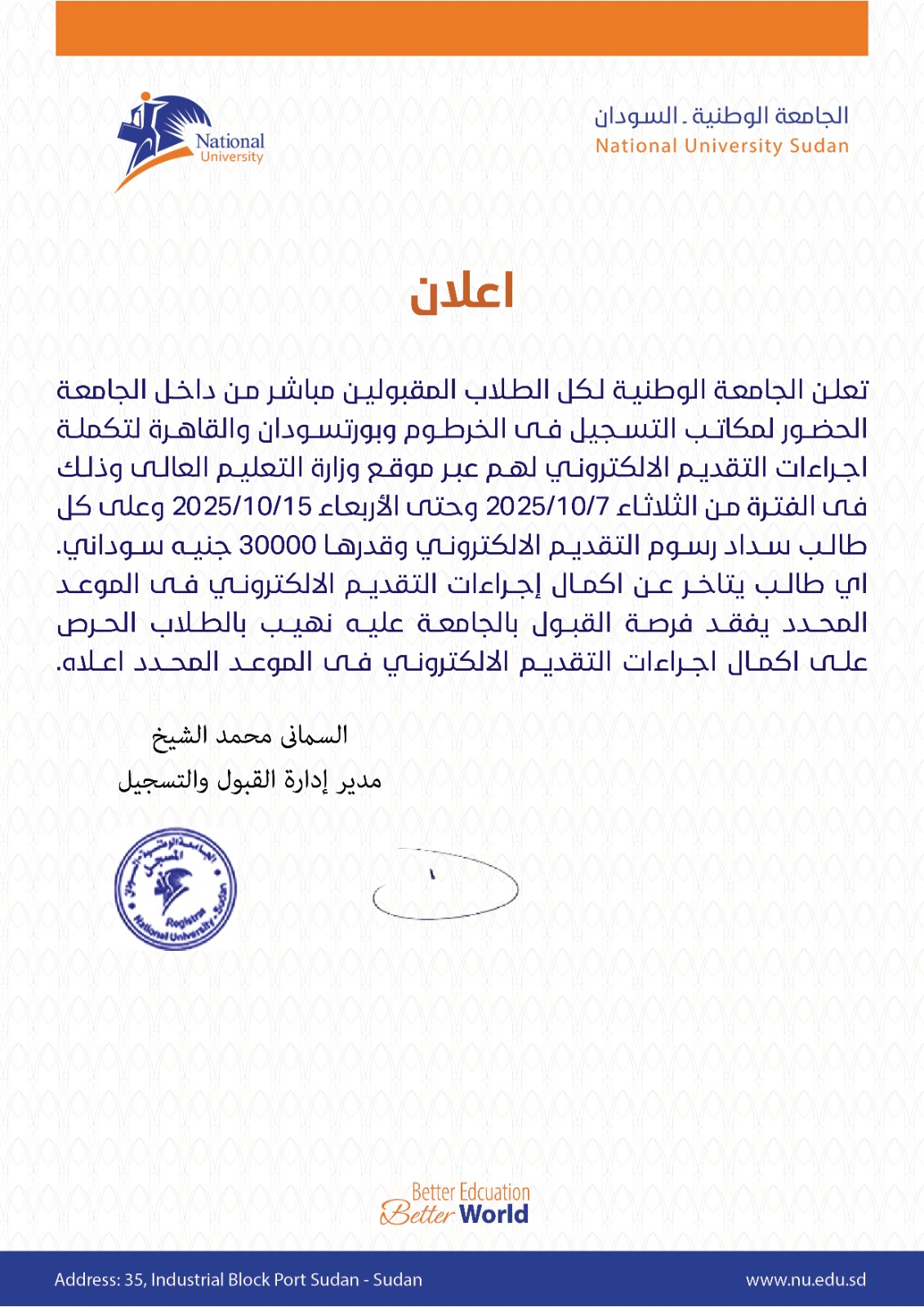 The National University announces to all students who have been directly admitted to the university that they must visit the registration offices in Khartoum, Port Sudan, and Cairo to complete their electronic admission procedures through the Ministry of Higher Education website.